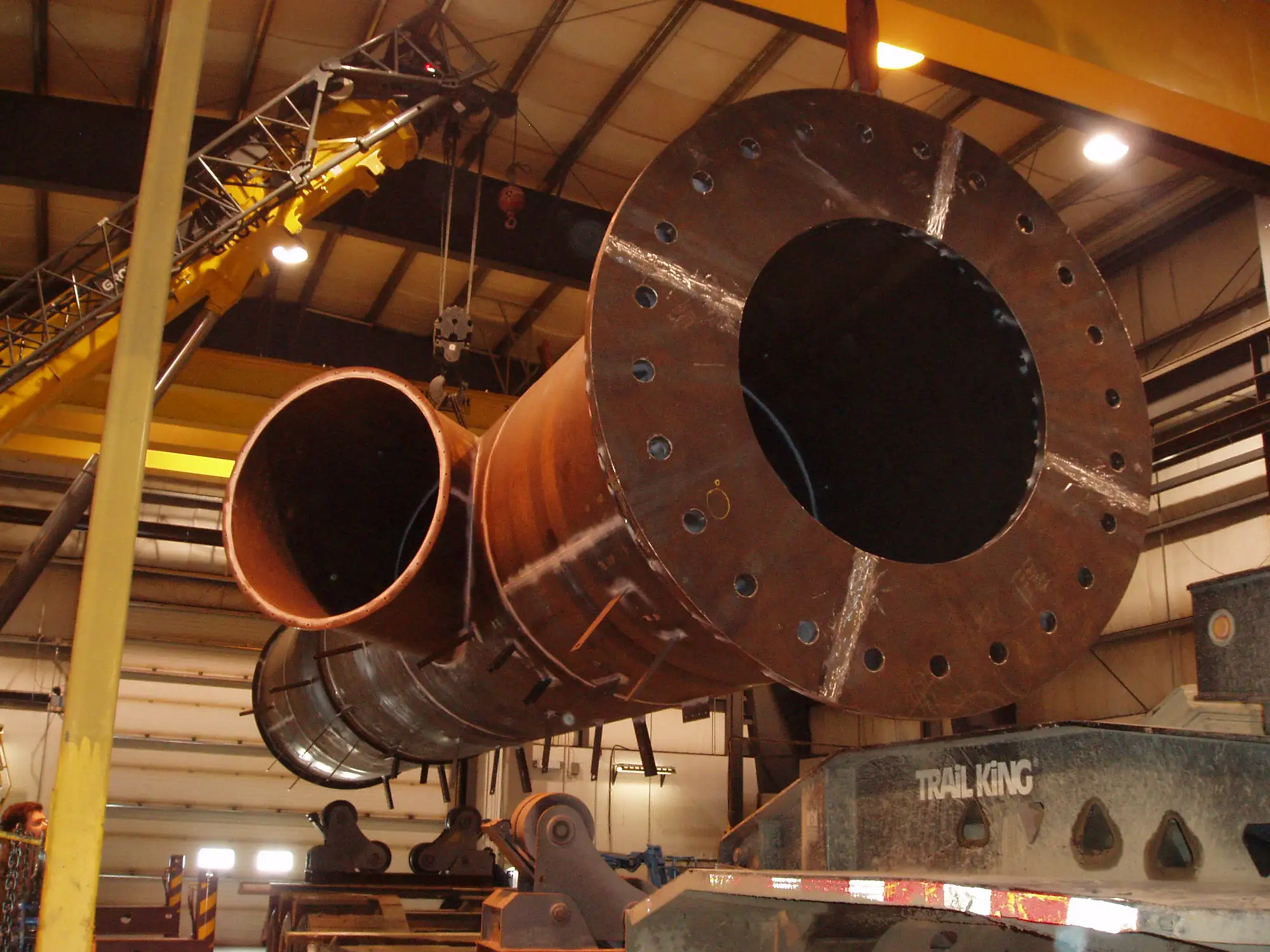 - All outer shell and internal riser shell welds required 100% complete joint penetration (CJP) welding. Radiography inspection was required on 100% of all T-Joints and 10% random radiography on all other circular and longitudinal seams. Welding needed to be performed in the flat position so welding machine set-up needed to be aligned and adjusted to track evenly. Design and build articulating fixtures for the Submerged Arc welding machine so the circular complete joint penetration (CJP) shell welds could be performed by the Submerged Arc and Flux Core automated tracking welding machines.