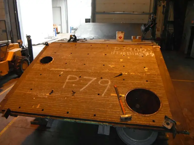 • The shell plates were up to 1-1/4” thick and had ½” on ½” thick chromium carbide overlay (CCO) plate over the majority of the inside surface area, with the remainder of the inside surface area covered with AR 400 wear plate. The liner plates had to be plug welded to the shell, requiring a three layer welding process, inclusive of capping with hard surfacing weld. Welding Data Sheets and procedures were developed for the plug welds for all-position welding, with the overhead corner welds of the liner plates presenting further challenges.